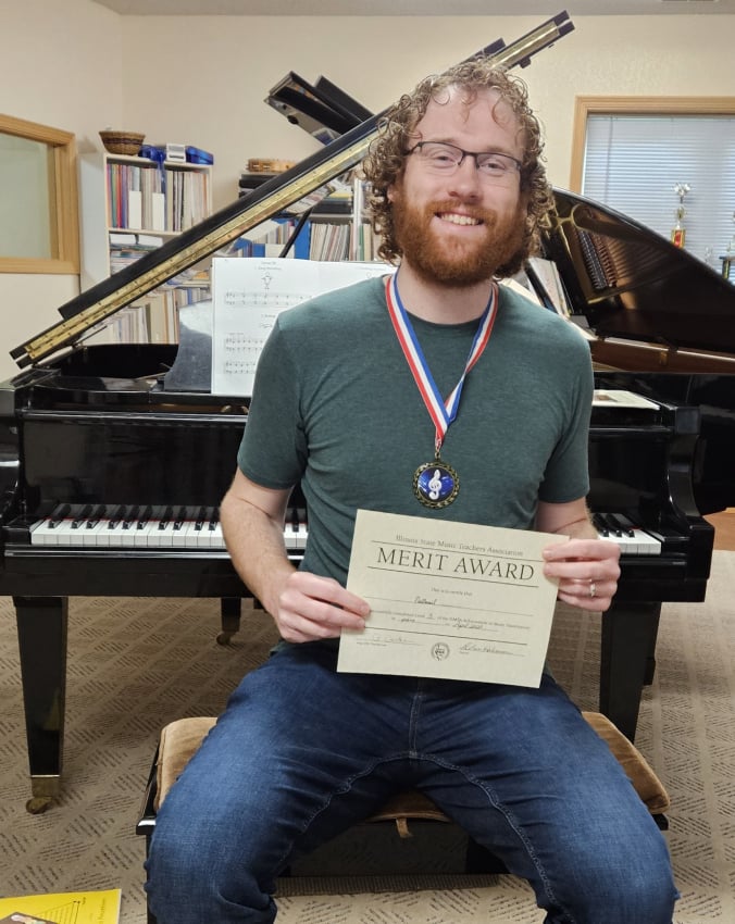 Congratulations, Nathaniel! You are Student of the Month for April 2025. You received a perfect score of 101 (bonus point) on your level 3 Theory Achievement in Music and 99.5 on the Performance Exam in April of 2025. The AIM exams are held through the Illinois Music Teachers Association. Students learn a lot when working on the requirements for their exam.